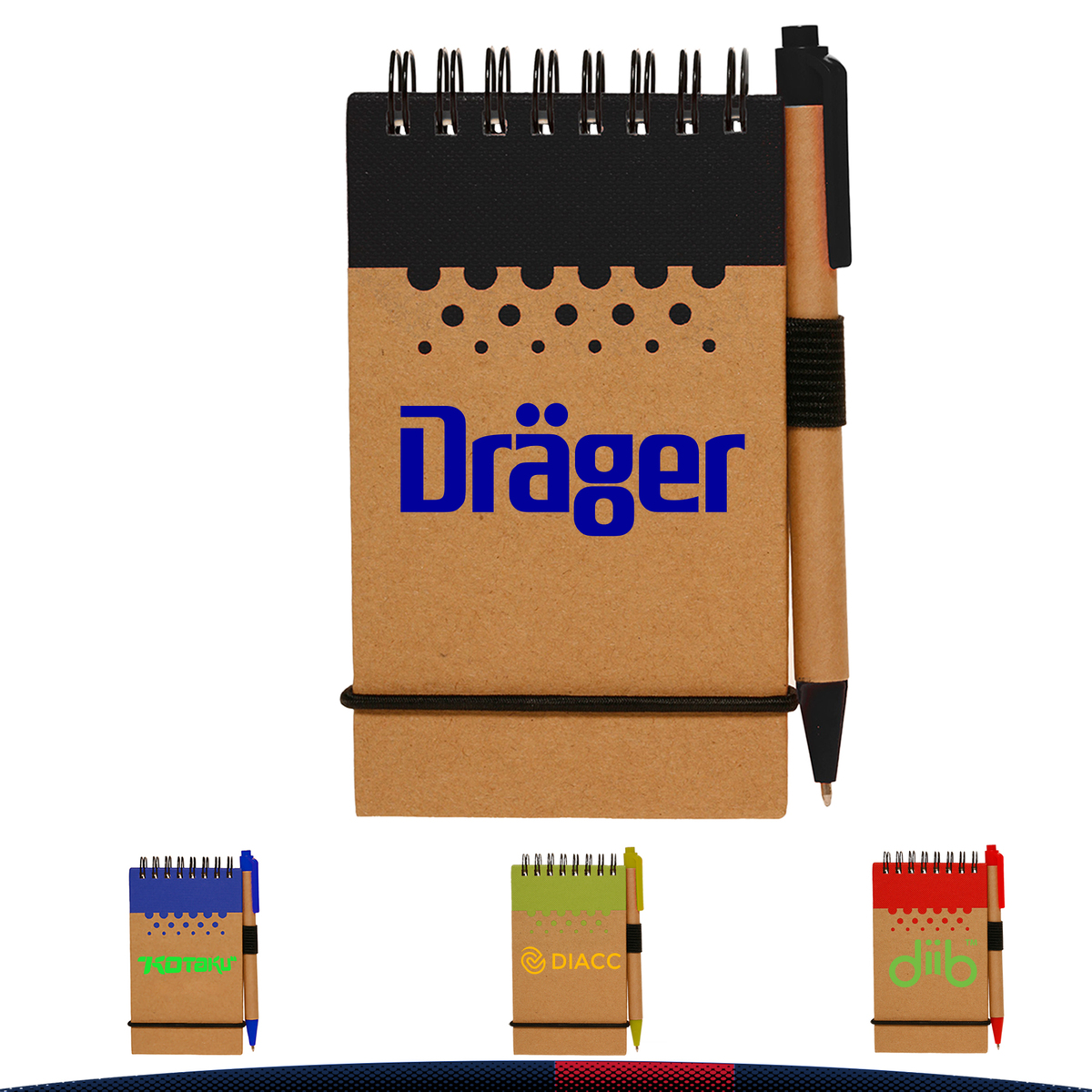 Introducing the ultimate way to elevate your brand and showcase your logo! The Buaka Recyclable Spiral Jotters are designed with 60 lined pages of smooth, easy-to-write-on paper (70GSM) and a recyclable cover featuring a colorful round accent for a touch of fun. The sleek black spiral binding keeps the pages secure, while the black elastic band ensures the jotter stays closed when not in use. Complete with a matching color recycled pen that writes in black ink and conveniently fits in the pen loop on the cover, these jotters are compact enough to slip into a backpack and are ideal for daily notetaking in school or at work. Elevate your brand with these stylish and practical jotters today! Rush 3 days available with rush charge upon request.
